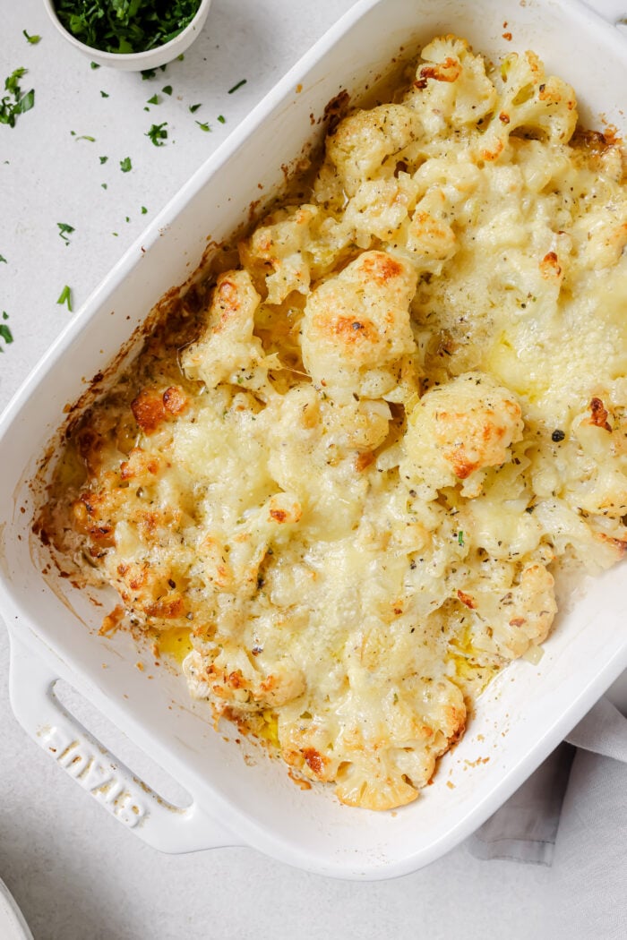 The cauliflower turns irresistibly tender in the oven, soaking up that creamy Parmesan sauce, while the golden, bubbly cheese on top adds the perfect finishing touch.