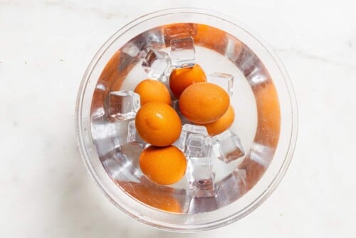 - Using a slotted spoon, remove the eggs from the saucepan and place them into a large bowl of ice water and let the eggs to sit for 5 minutes to stop the cooking process and to cool down.
