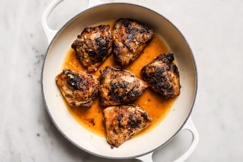 - Be careful not to flip or move the chicken too soon. Once it’s ready, the chicken thighs will self-release from the pan without much effort at all.
