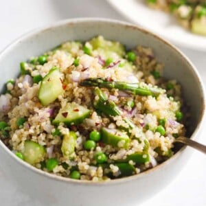 This Spring Quinoa Salad recipe is loaded with asparagus, peas, cucumber, and red onions with an easy and delicious homemade vinaigrette.