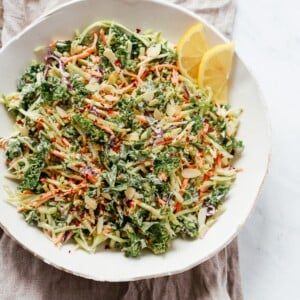 And it comes together so easily because you’ll use a bag of broccoli slaw found in the produce aisle. To make this Broccoli Kale Slaw Salad, you really have to do only two things: chop kale and make the homemade mayo, which takes only 1 minute to make.